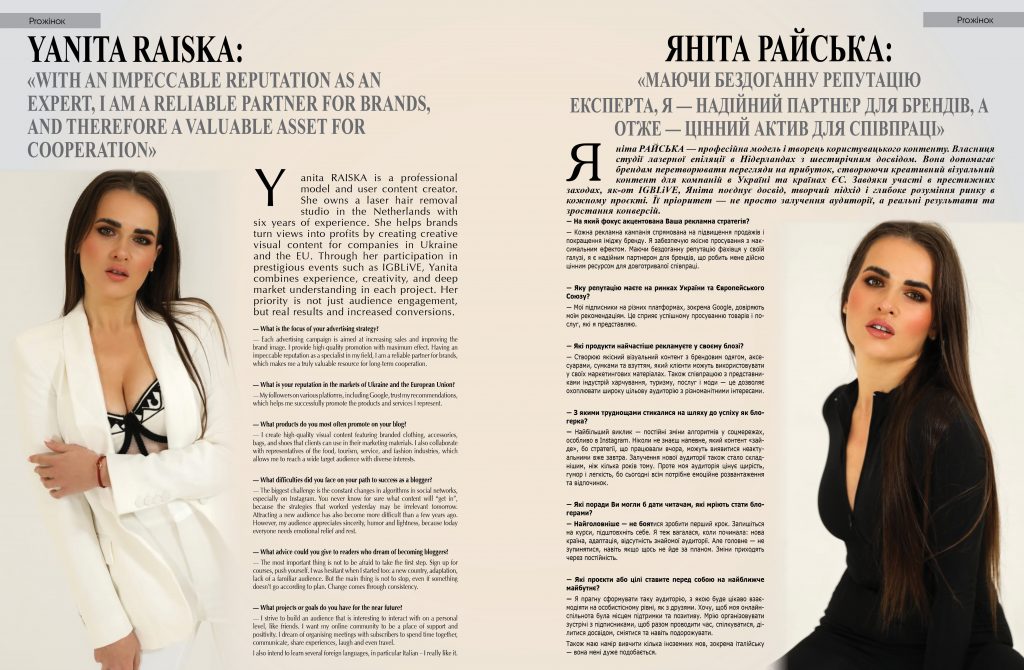 Yanita RAISKA is a professional model and user content creator. She owns a laser hair removal studio in the Netherlands with six years of experience. She helps brands turn views into profits by creating creative visual content for companies in Ukraine and the EU. Through her participation in prestigious events such as IGBLiVE, Yanita combines experience, creativity, and deep market understanding in each project. Her priority is not just audience engagement, but real results and increased conversions.