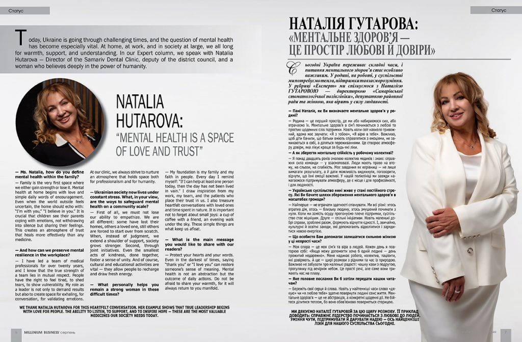 Today, Ukraine is going through challenging times, and the question of mental health has become especially vital. At home, at work, and in society at large, we all long for warmth, support, and understanding. In our Expert column, we speak with Natalia Hutarova — Director of the Samariv Dental Clinic, deputy of the district council, and a woman who believes deeply in the power of humanity.