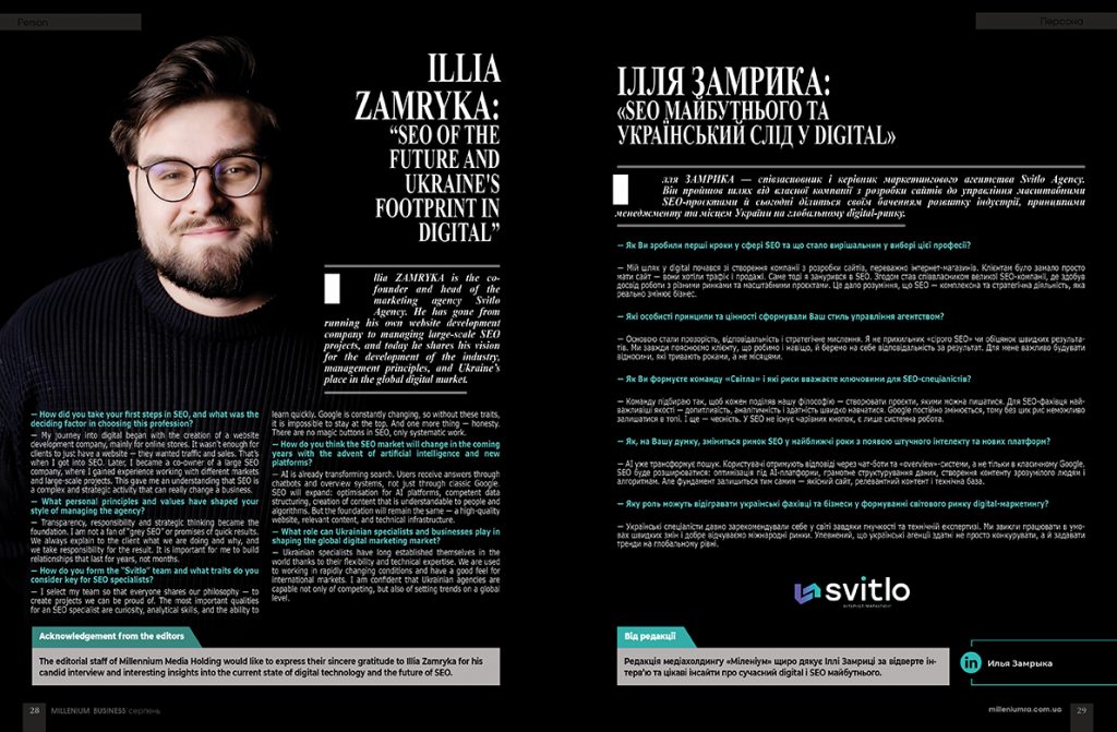 Іllia ZAMRYKA is the co-founder and head of the marketing agency Svitlo Agency. He has gone from running his own website development company to managing large-scale SEO projects, and today he shares his vision for the development of the industry, management principles, and Ukraine’s place in the global digital market.