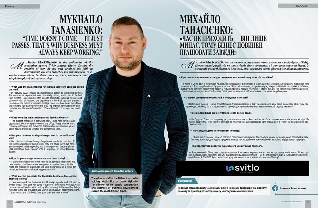 Мykhailo TANASIIENKO is the co-founder of the marketing agency Svitlo Agency (Kyiv). Despite the realities of war, he not only retained his faith in development, but also launched his own business. In a candid conversation, he shares his experience, challenges, and his philosophy of entrepreneurship.
