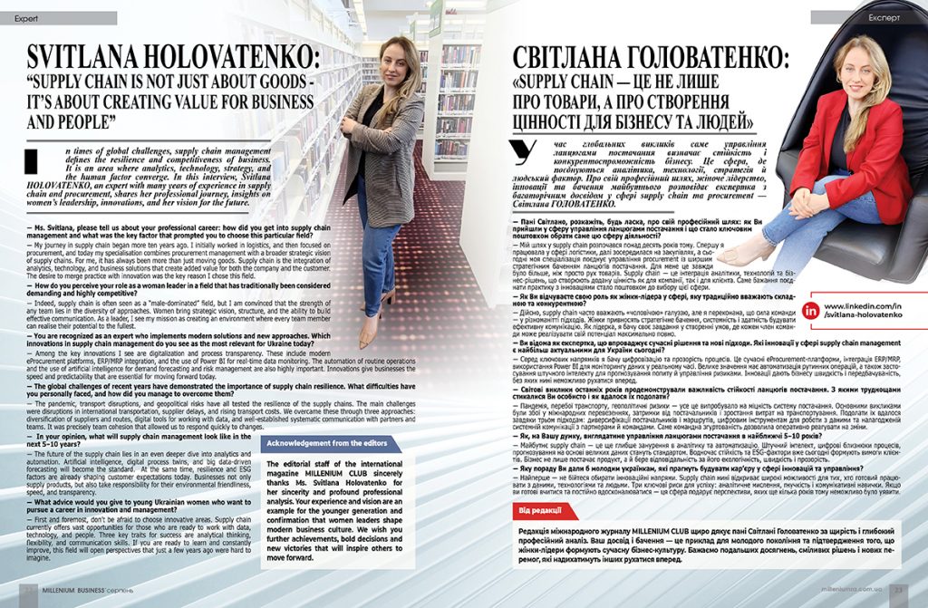 Іn times of global challenges, supply chain management defines the resilience and competitiveness of business. It is an area where analytics, technology, strategy, and the human factor converge. In this interview, Svitlana HOLOVATENKO, an expert with many years of experience in supply chain and procurement, shares her professional journey, insights on women’s leadership, innovations, and her vision for the future.
