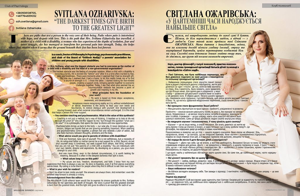 Редакція MILLENIUM CLUB висловлює щиру вдячність пані Світлані Ожарівській за відвертість та глибину думок. Її історія — це свідчення того, що найбільша сила народжується з найбільших випробувань. А світло, яке вона дарує іншим, — приклад для кожного з нас.
