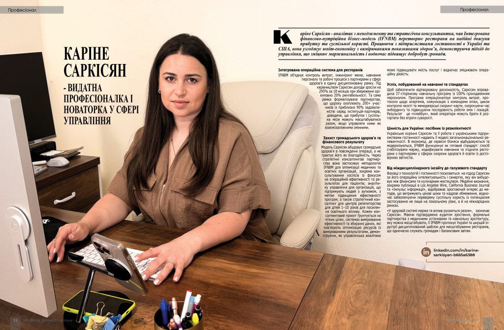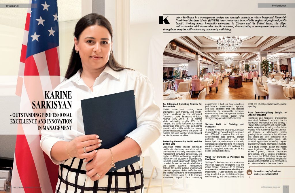 Каріне Саркісян – аналітик з менеджменту та стратегічна консультантка, чия Інтегрована фінансово-нутріційна бізнес-модель (IFNBM) перетворює ресторани на надійні двигуни прибутку та суспільної користі. Працюючи з підприємствами гостинності в Україні та США, вона узгоджує юніт-економіку з вимірюваними показниками здоров’я, демонструючи підхід до управління, що зміцнює маржинальність і водночас підвищує добробут громади.