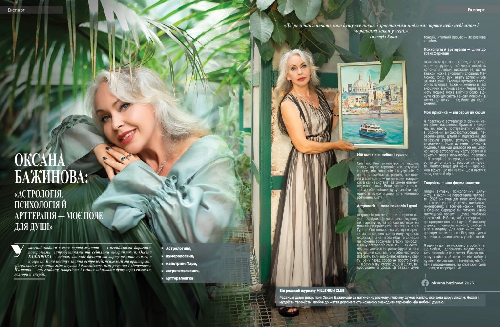 У кожної людини є своя карта життя — з невидимими дорогами, поворотами, випробуваннями та світлими відкриттями. Оксана БАЖИНОВА — жінка, яка вміє бачити цю карту не лише очима, а й серцем. Вона поєднує знання астрології, психології та арттерапії, відкриваючи гармонію між наукою і духовністю, між розумом і відчуттям. Її історія — про глибину, творчість і вміння зцілювати душу через символи, кольори й енергії.