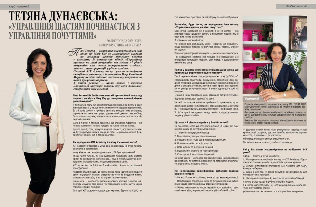 Редакція міжнародного глянсового журналу MILLENIUM CLUB щиро дякує пані Тетяні Дунаєвській за глибоку й відверту розмову, яка надихє.