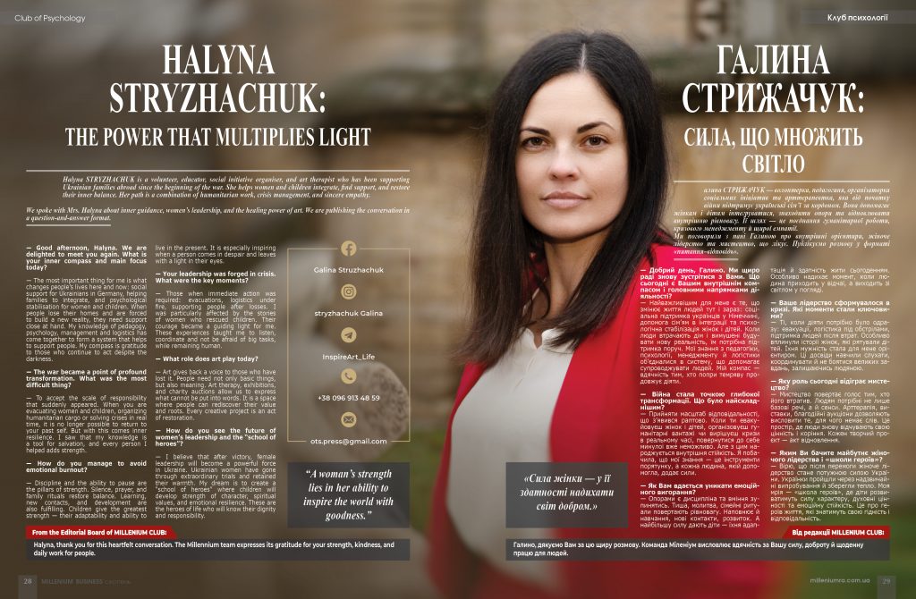 Halyna, thank you for this heartfelt conversation. The Millennium team expresses its gratitude for your strength, kindness, and daily work for people.