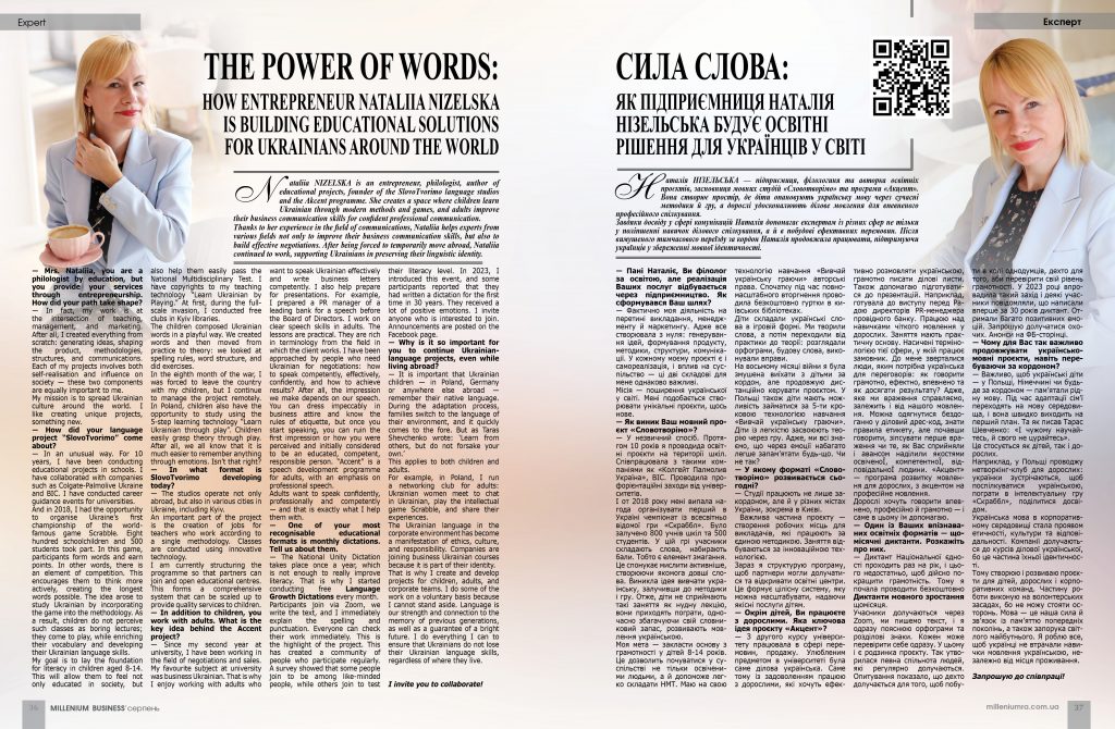 Наталія НІЗЕЛЬСЬКА — підприємиця, філологиня та авторка освітніх проєктів, засновниця мовних студій «Словотворімо» та програми «Акцент». Вона створює простір, де діти опановують українську мову через сучасні методики й гру, а дорослі удосконалюють ділове мовлення для впевненого професійного спілкування.
