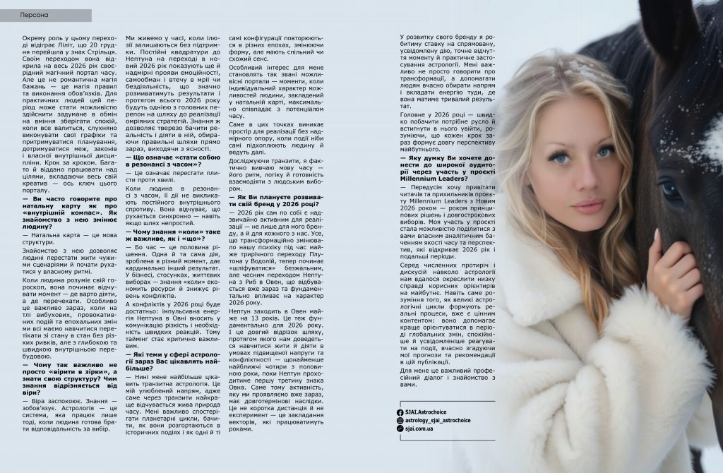 — 2026 рік сам по собі є надзвичайно активним для реалізації — не лише для мого бренду, а й для кожного з нас. Усе, що трансформаційно змінювало нашу психіку під час майже трирічного переходу Плутона у Водолій, тепер починає «шліфуватися» безжальним, але чесним переходом Нептуна з Риб в Овен, що відбувається вже зараз та фундаментально впливає на характер 2026 року.