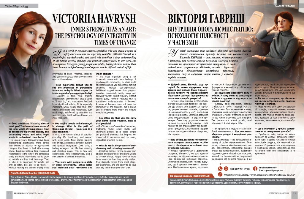 Редакція Millenium Club щиро дякує Вікторії Гавриш за глибоку, відверту розмову та бажає їй подальшого професійного зростання, внутрішньої гармонії й реалізації проєктів, що змінюють життя людей на краще.