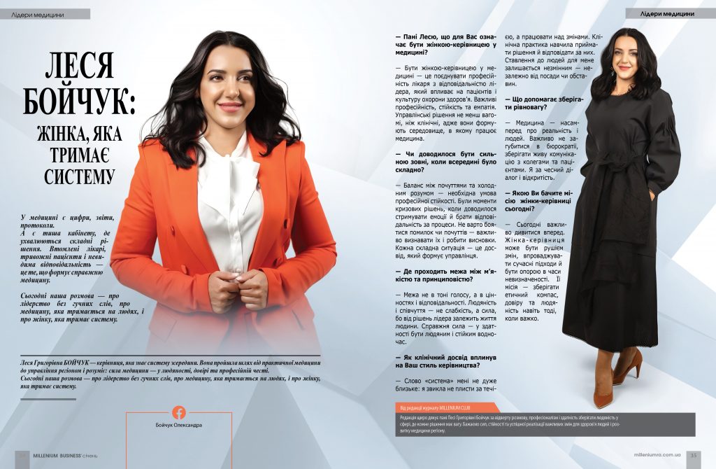 Редакція щиро дякує пані Лесі Григорівні Бойчук за відверту розмову, професіоналізм і здатність зберігати людяність у сфері, де кожне рішення має вагу. Бажаємо сил, стійкості та успішної реалізації важливих змін для здоров’я людей і розвитку медицини регіону.