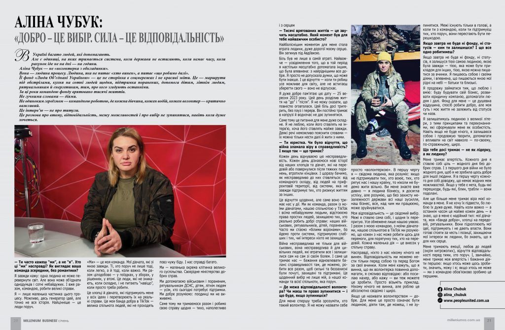 Це відчуття щоденне, але саме воно тримає нас у дії. Ми як команда, разом із моїми дівчатами, нашою спільнотою у TikTok і всіма небайдужими людьми, відстоюємо права простих людей, захищаємо тих, хто реально робить добрі справи: наших військових, рятувальників, дітей, поранених. Часто ми стаємо «білими воронами», бо йдемо проти системи, підтримуємо слабших і тих, чиї інтереси ніхто не захищає.