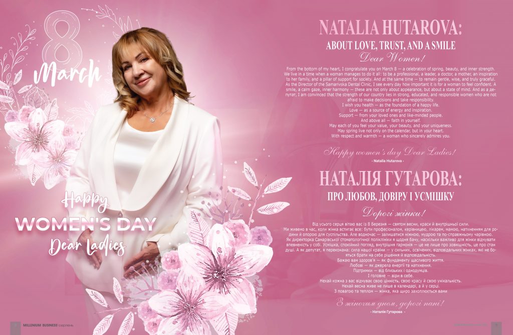 Як директорка Самарівської стоматологічної поліклініки я щодня бачу, наскільки важливо для жінки відчувати впевненість у собі. Усмішка, спокійний погляд, внутрішня гармонія — це не лише про зовнішність, це про стан душі. А як депутат, я переконана: сила нашої країни — у сильних, освічених, відповідальних жінках, які не бояться брати на себе рішення й відповідальність.