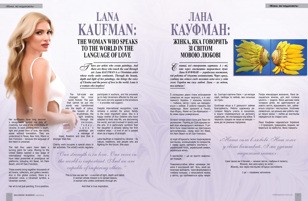 Тhere are artists who create paintings. And there are those who touch the soul through art. Lana KAUFMAN is a Ukrainian artist whose works unite continents. Through the beauty, depth and light of her paintings, she brings the voice of Ukraine and the power of love to the world. Lana is a woman who inspires!