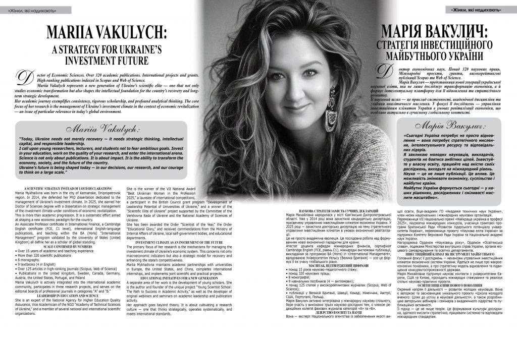 Марія Вакулич — представниця нової генерації української наукової еліти, яка не лише досліджує трансформацію економіки, а й формує інтелектуальну платформу для її відновлення та стратегічного розвитку.