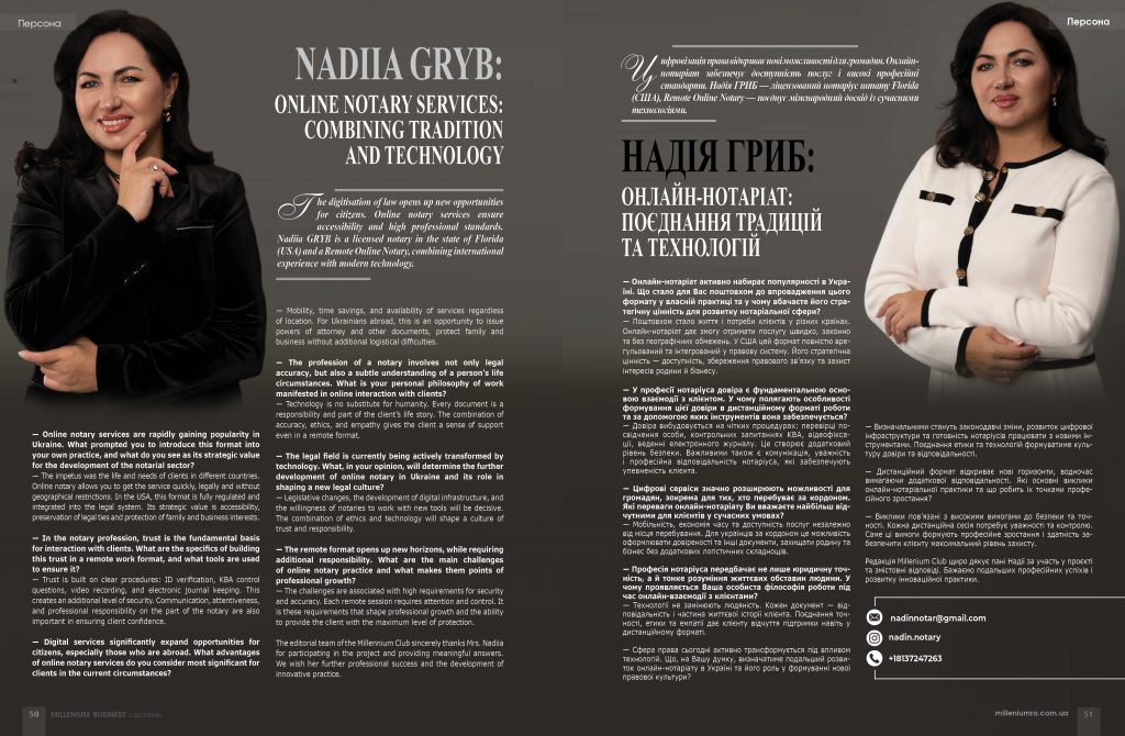 Цифровізація права відкриває нові можливості для громадян. Онлайн-нотаріат забезпечує доступність послуг і високі професійні стандарти. Надія ГРИБ — ліцензований нотаріус штату Florida (США), Remote Online Notary — поєднує міжнародний досвід із сучасними технологіями.